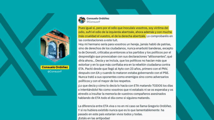 Y es que según cuenta en un extenso tuit, en lo que más confiaba su hermano "era en la rebelión ciudadano contra ETA" y con la misma ha lanzado un mensaje ala presidenta 'popular': "Nunca trató a sus oponente como enemigos sino como adversarios políticos y con el mayor de los respetos". Y ha finalizado: "Os atrevéis a insultar la memoria de vuestro compañeros asesinados hablando de ETA todo el día como si siguiera matando".