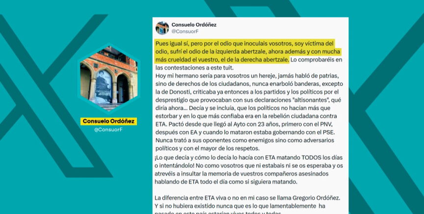 Pero llegó lejos y hasta Consuelo Ordóñez, presidenta de Covite y hermana del asesinado, que, con la paciencia colmada, no ha dudado en lanzarse contra la presidenta de Madrid para dejarle claro que el nombre de su hermano no vale para hacer política. "Pues igual sí, pero por el odio que inoculáis vosotros. Soy víctima del odio, sufrí el odio de la izquierda abertzale ahora y con mucha más crueldad el vuestro, el de la derecha abertzale", ha espetado este viernes sin cortapisas.