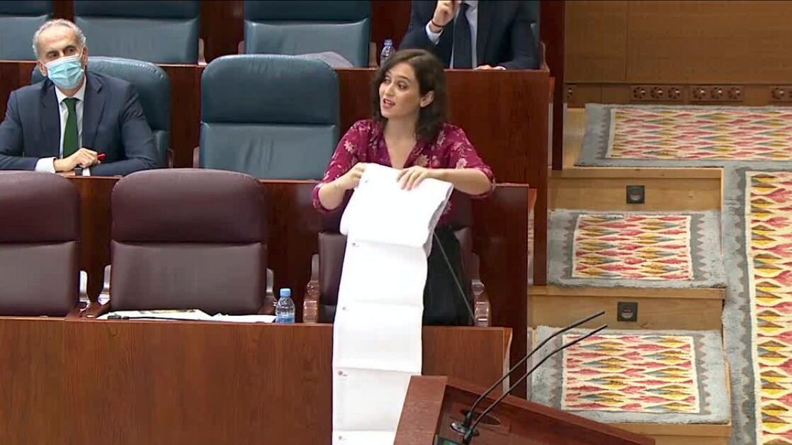 "Esto que ven aquí", ha dicho Díaz Ayuso extendiendo una larga retahíla de folios delante de su escaño, "501 residencias de mayores, 161 de discapacidad y 81 de religiosas, que también tienen derecho a la vida aunque no les importe. Todo esto han sido residencias donde hemos llevado material de protección, residencias que hemos visitado, los hasta 10.600 traslados que hemos realizado... Y esto son los datos de lo que ha hecho también este Gobierno", ha contestado a Gómez Perpinyà