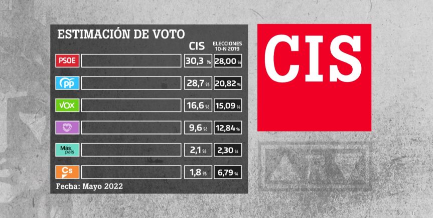 La encuesta del Centro de Investigaciones Sociológicas, elaborada entre el 3 y el 12 de mayo, en plena crisis por el espionaje, apunta a una importante subida de Vox, que en solo un mes sube 2,2 puntos hasta el 16,6% de los sufragios, justo lo contrario que Unidas Podemos, que se deja otro punto desde abril y se queda en el 9,6% .