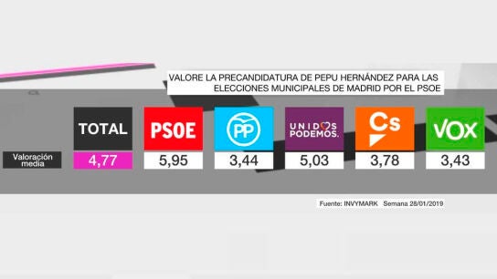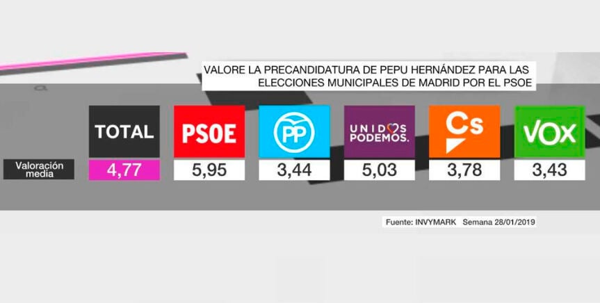 La mayor nota a Pepu Hernández le llega de los simpatizantes socialistas, le dan casi un 6, un 5 los votantes de Unidos Podemos. De momento, en los partidos de izquierda solo hay un candidato confirmado a la alcaldía y es Manuela Carmena.