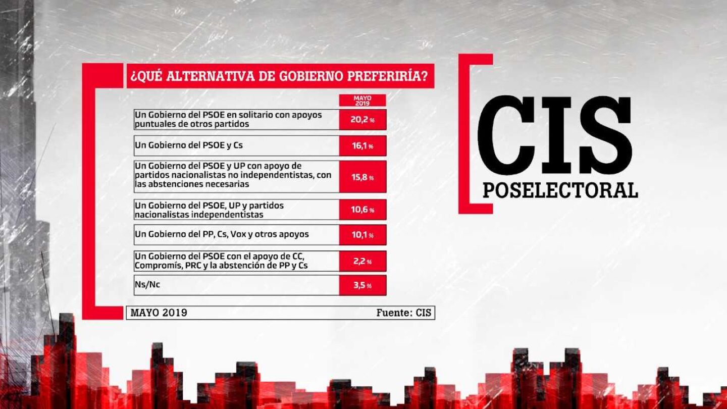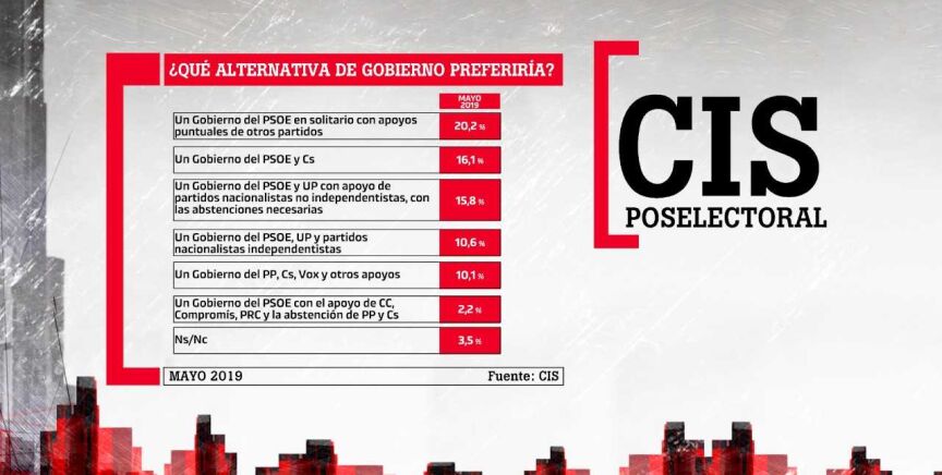 Aunque son mayoría los que apuestan por algún tipo de coalición, aunque con diversas fórmulas. La opción de gobierno de PSOE con Ciudadanos es laelegida por un 16,1%. Un gobierno del PSOE con Unidas Podemos con apoyo de partidos nacionalistas no independentistas y las abstenciones necesarias es apoyada por el 15,8% de los encuestados.