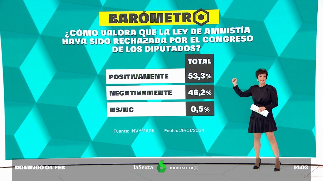 El barómetro de laSexta pregunta a los españoles por el tema que marca la política a nivel nacional, una ley de amnistía que ha sufrido un varapalo en el Congreso de los Diputados con el rechazo de Junts y su vuelta a la Comisión de Justicia.