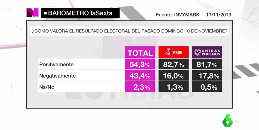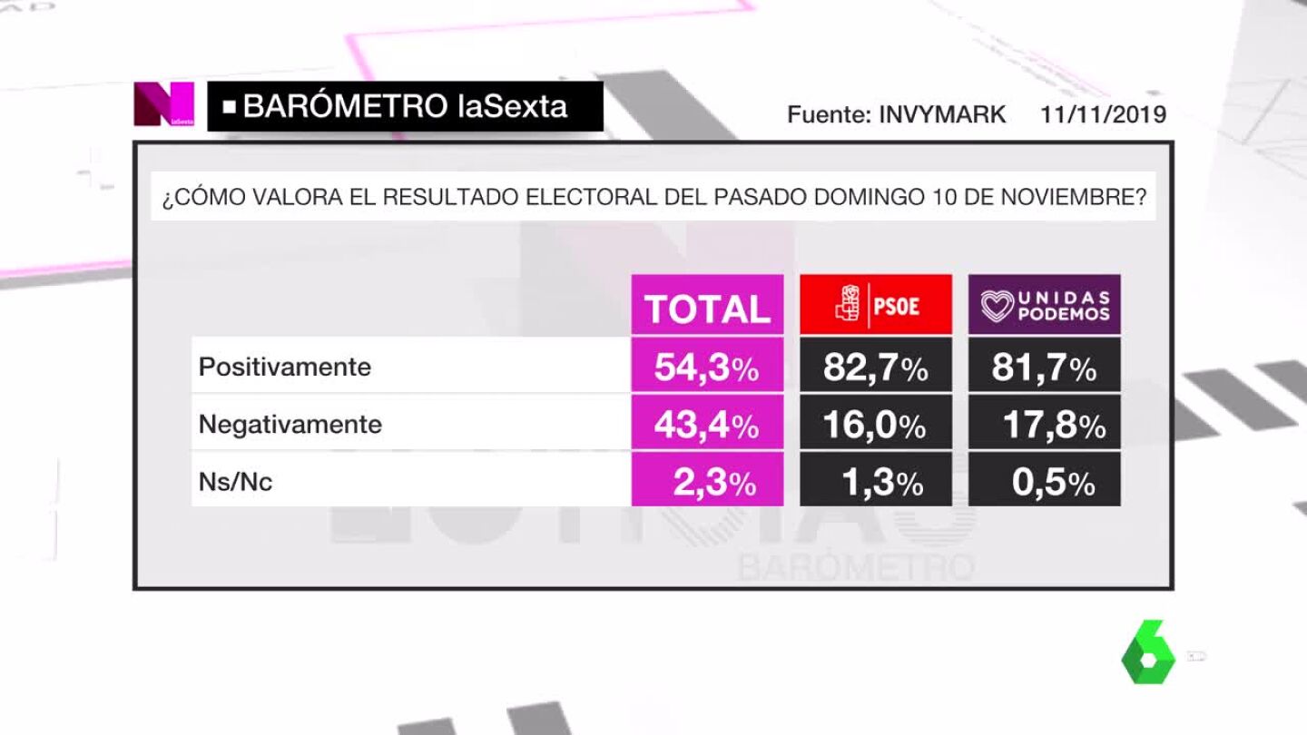 Barómetro laSexta: el 54,3% de los encuestados valora positivamente el resultado electoral del 10N