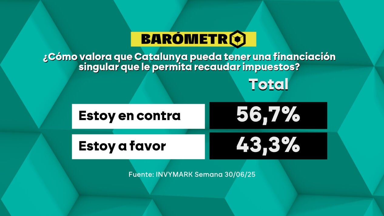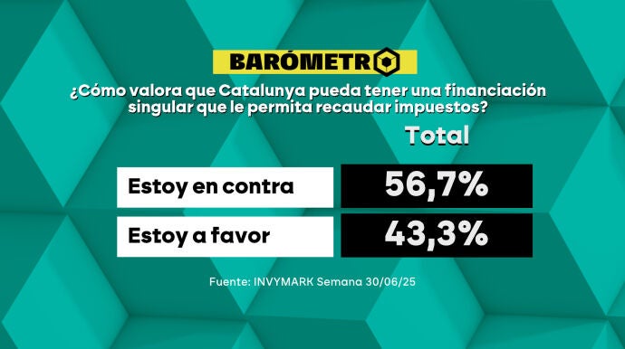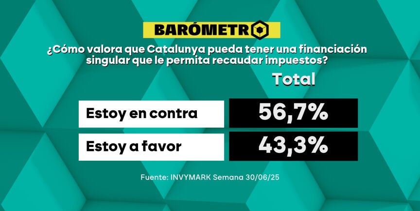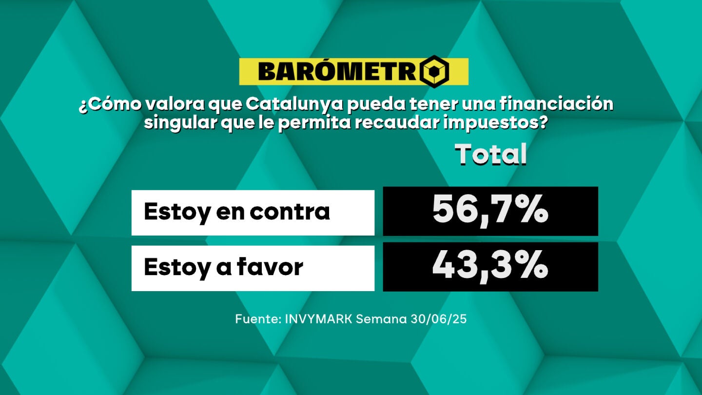 Los españoles están divididos sobre la financiación singular para Catalunya. Según el barómetro de laSexta, la mayoría del 56,7% de los encuestados se opone a que Catalunya pueda recaudar sus propios impuestos, mientras el 43,3% está a favor.