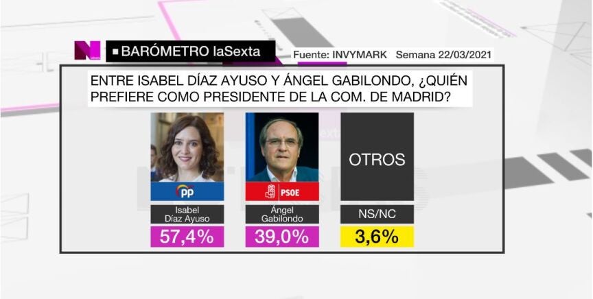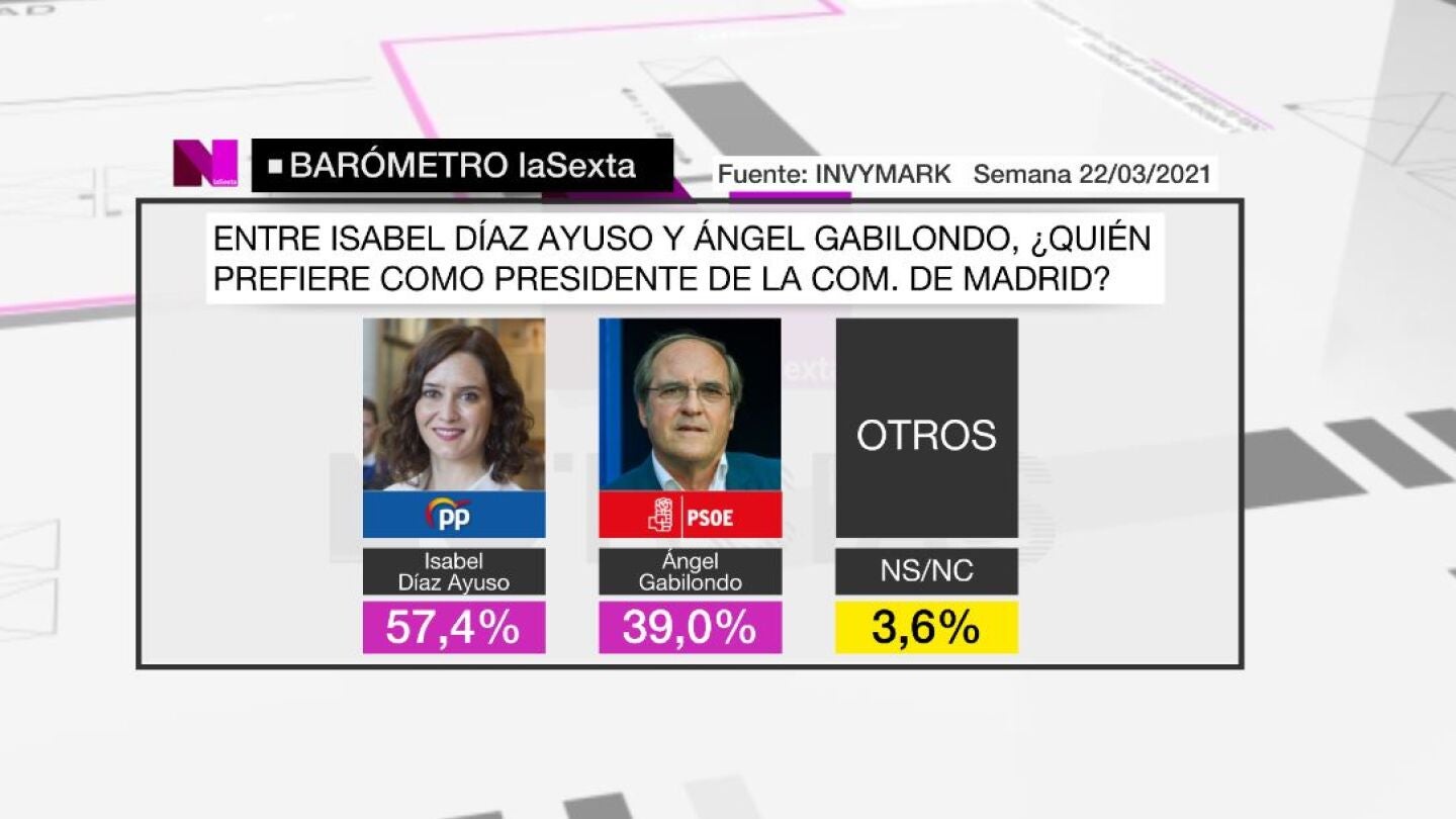El 57,4% de los madrileños prefieren a Isabel Díaz Ayuso al frente de la Comunidad de Madrid y solo el 39% de los ciudadanos quieren a Ángel Gabilondo. Estos son los datos que arroja el gran Barómetro de laSexta, con más de 2.400 entrevistas, con motivo de las elecciones del 4 de mayo.