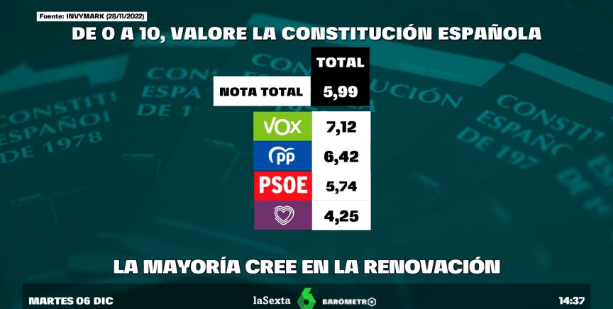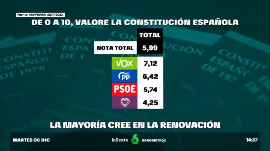 Son los resultados de la última encuesta Invymark para laSexta. Con motivo del Día de la Constitución, en laSexta hemos preguntado a los españoles sobre cómo valoran el texto constituyente que cumple 44 años en este 6 de diciembrede 2022.