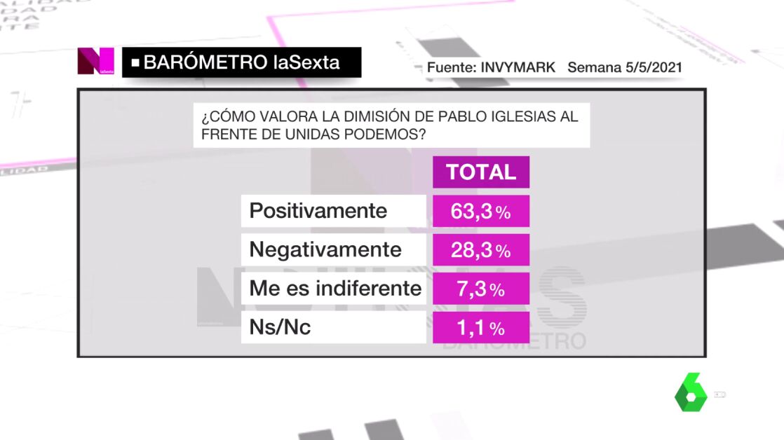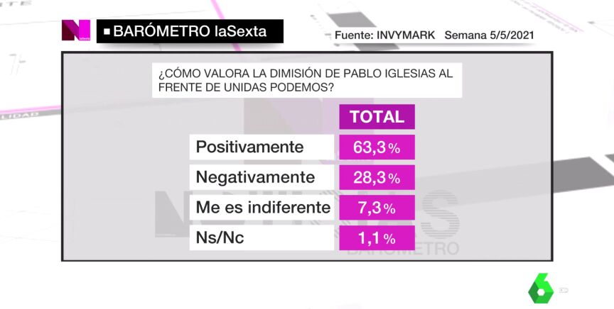 Nueva edición del barómetro de laSexta, que se centra en el adiós de Pablo Iglesias de la política nacional. Un 63,3% de los encuestados valora positivamente este movimiento, con un 28% que lo ve de forma negativa.