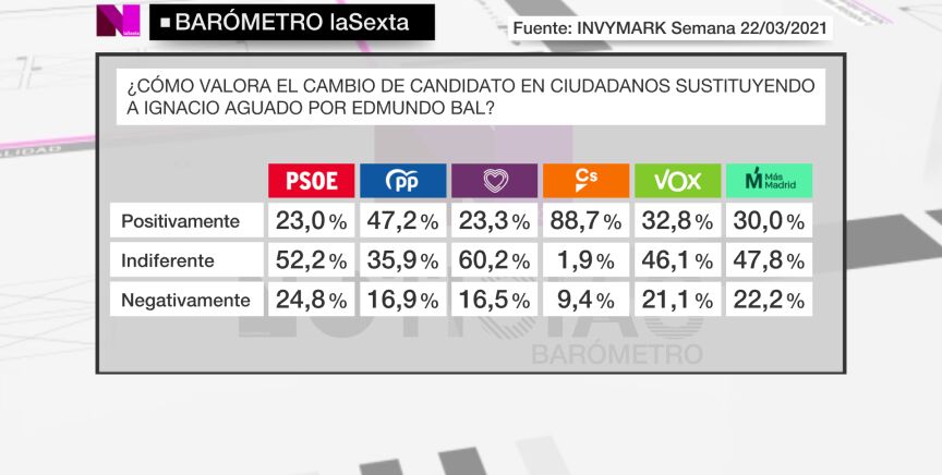 Casi nueve de cada diez votantes de Ciudadanos valora "positivamente" el cambio de Ignacio Aguado por Edmundo Bal como candidato a las elecciones autonómicas de la Comunidad de Madrid.
