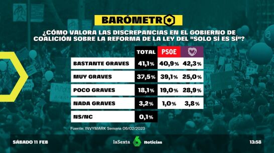 Según el barómetro de laSexta, casi el 40% de los encuestados valora como "muy graves" las discrepancias en el Gobierno de coalición en torno a la polémica por la reforma del 'solo sí es sí, frente a un 18% que lo considera de "poca gravedad".