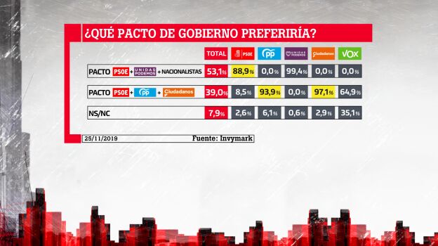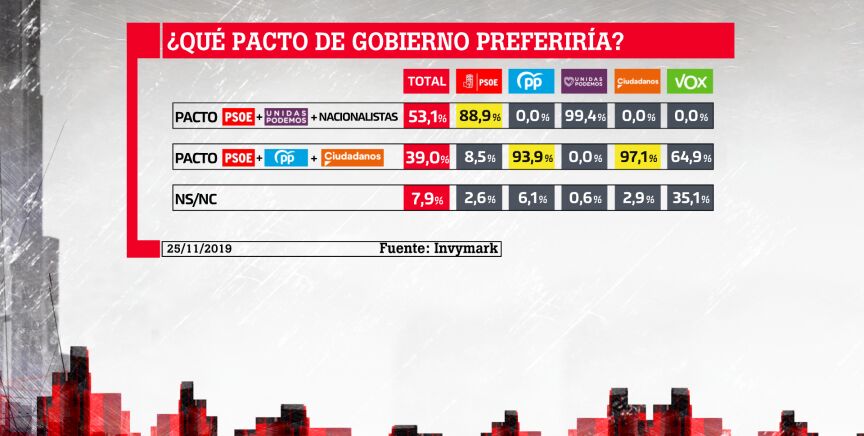 La mayoría de encuestados prefiere un acuerdo entre PSOE, Unidas Podemos y nacionalistas para desbloquear el Gobierno, mientras que un 39% opta por uno entre PSOE, PP y Ciudadanos.