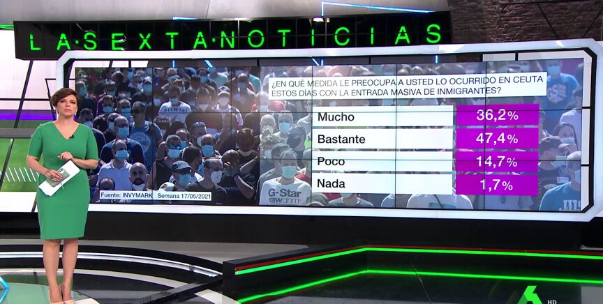 Las imágenes de la llegada masiva de migrantes a Ceuta preocupa a la mayoría de encuestados en el barómetro de laSexta: más del 83% de encuestados está bastante o muy preocupado. Se trata de la suma del 36,2% que está muy preocupado y del 47,4% que lo está bastante, mientras que 14,7% está poco preocupado y el 1,7% nada.