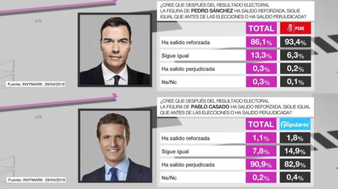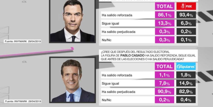 Todo lo contrario que la figura de Pedro Sánchez. Según el 86% de los encuestados sale reforzado del 28A. Entre los votantes del PSOE aún hay mayor convencimiento. Piensan así el 93,4%.