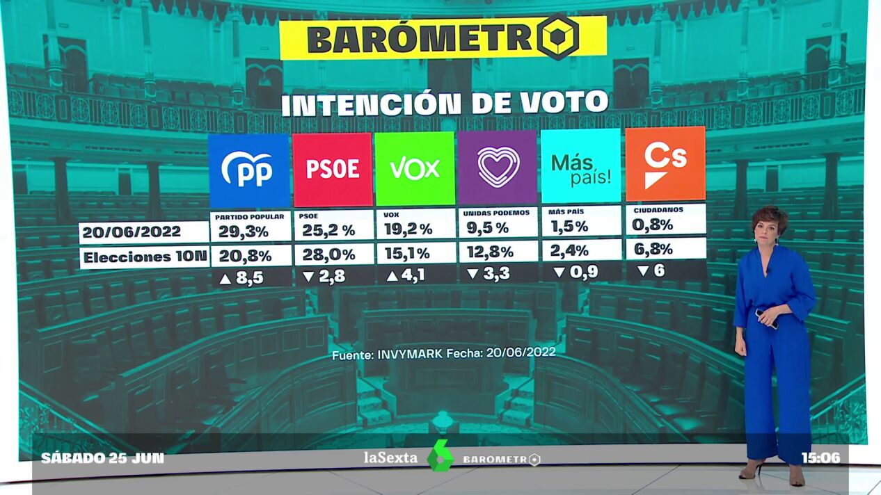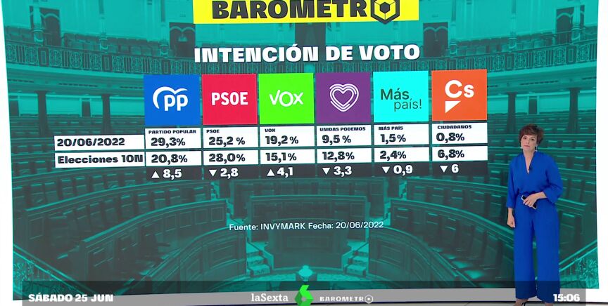 Con estos resultados, el PP sumaría 8,5 puntos más con respecto a los resultados de las últimas elecciones generales, mientras que los socialistas perderían 2,8. La extrema derecha subiría 4,1 puntos; Podemos perdería 3,3 y Más País 0,9, mientras que Cs perdería 6.