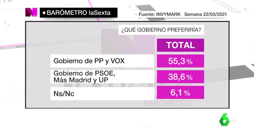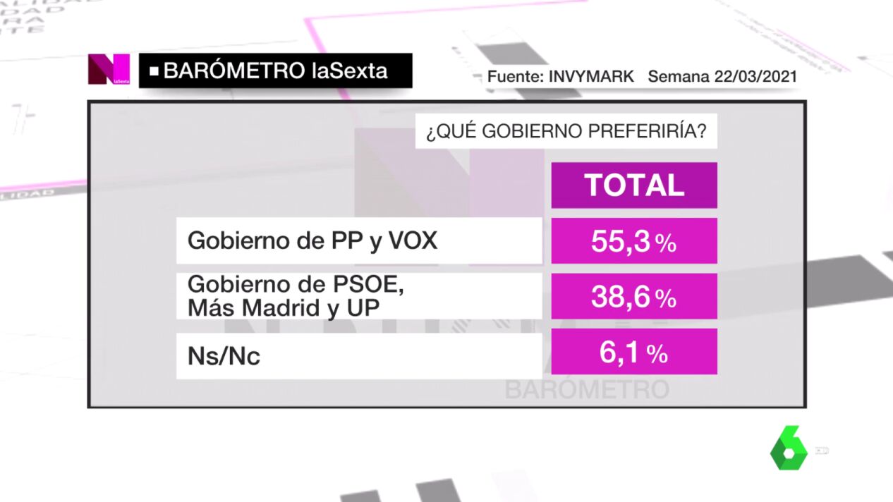 En el gran barómetro de laSexta de cara a las elecciones de la Comunidad de Madrid del 4 de mayo podemos ver que más de la mitad de los encuestados apuesta por un Gobierno formado por la suma de Partido Popular y Vox por encima de una posible coalición entre PSOE, Más Madrid y Unidas Podemos.