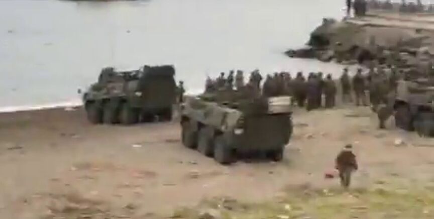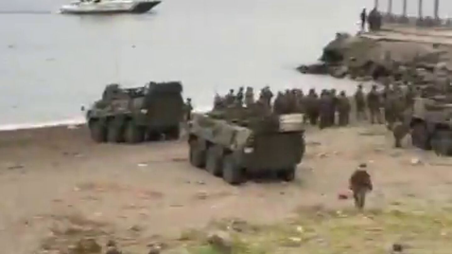 Carros de combate y soldados en la playa de El Tarajal para impedir la entrada de inmigrantes a nado en Ceuta