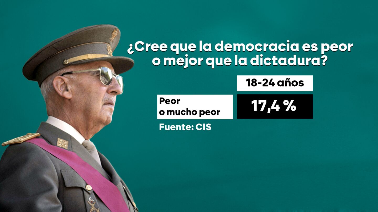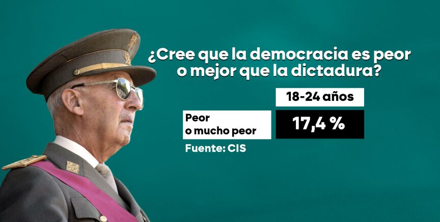 En noviembre se cumplirán 50 años de la muerte de Franco y el Centro de Investigaciones Sociológicas (CIS) ha preguntado sobre la dictadura franquista. Para más de un 21% de la población española, los años de franquismo fueron "buenos" o "muy buenos", porcentaje muy similar al que vemos en jóvenes de entre 18 y 24 años (que no vivieron la dictadura), con casi un 20% que la valora positivamente, es decir, dos de cada diez.