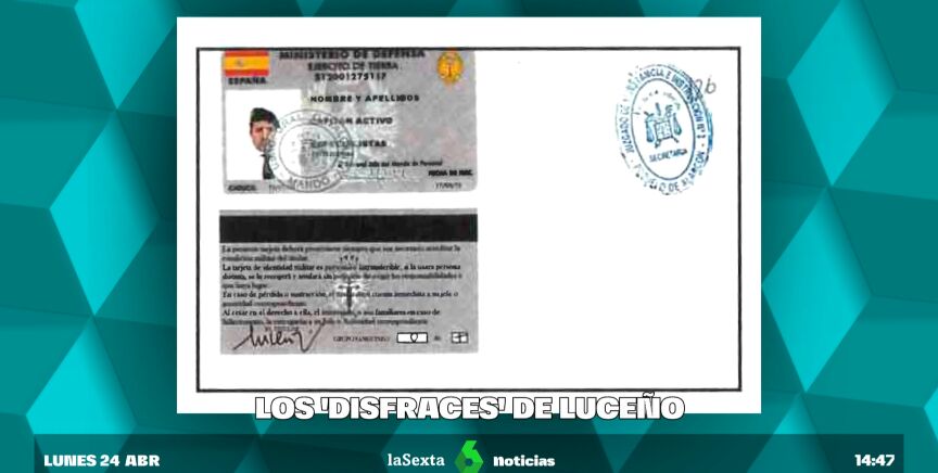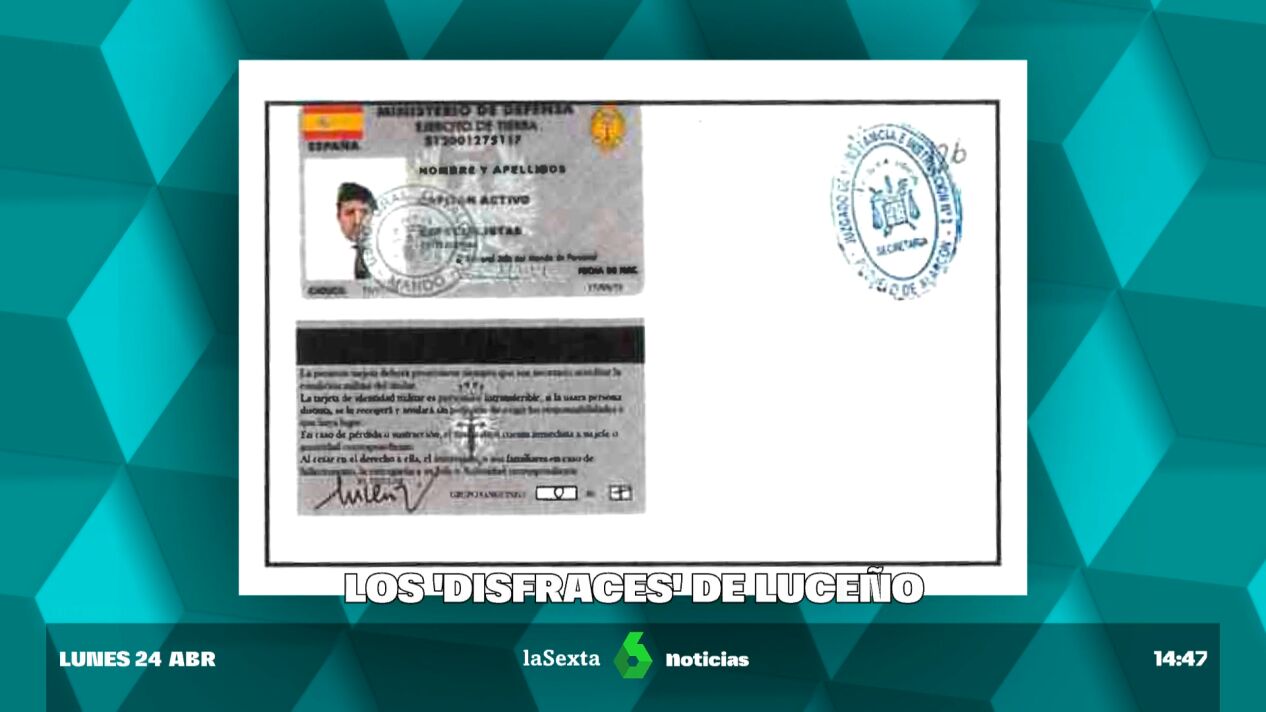 El último informe que la Policía Nacional ha enviado al juez Adolfo Carretero en la causa en la que se les investiga, al que ha tenido acceso laSexta, incluye documentos de identidad falsificados en los que Luceño se habría hecho pasar por asesor de Seguridad del CNI, asesor de Seguridad del Departamento de Seguridad Nacional - Presidencia del Gobierno, capitán en activo del Ejército de Tierra y miembro honorario del Cuerpo Nacional de Policía.