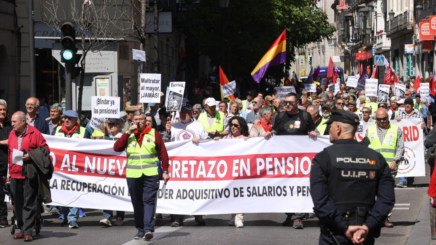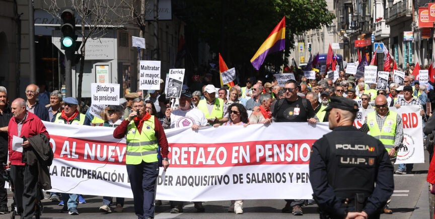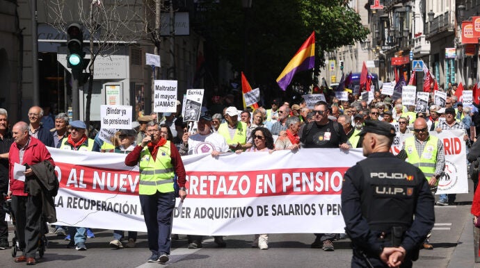 Los manifestantes, convocados por la Coordinadora General de Pensionistas de Madrid, han mostrado su descontento con pancartas como 'Pensiones de segunda, no', 'Blindar las pensiones' y 'Jubilados, jorobados'.