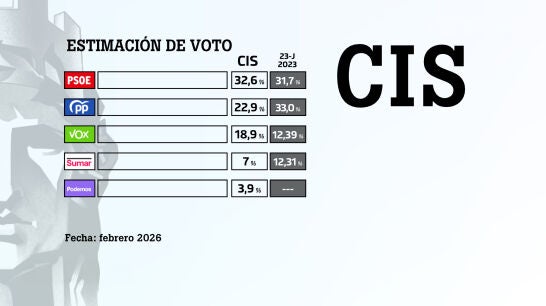El Centro de Investigaciones Sociológicas (CIS) dirigido por José Félix Tezanos sigue colocando al PSOE como el partido político con más escaños. Según el barómetro de febrero, los socialistas obtendrían el 32,6% de los apoyos, casi diez puntos por encima del PP (22,9%), que a su vez superaría a Vox por solo cuatro puntos (18,9%).