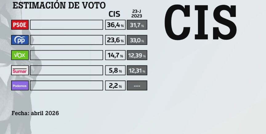 El Centro de Investigaciones Sociológicas (CIS) mantiene al PSOE como el vencedor en unas elecciones generales si se celebraran hoy, con el 36,4% de los votos. Un porcentaje que supone 4,6 puntos más que hace un mes y que eleva la distancia de los socialistas sobre el PP hasta los 12,8 puntos, 4,3 más que en marzo. Los populares apenas crecen 0,3 puntos y se quedan en el 23,6%.