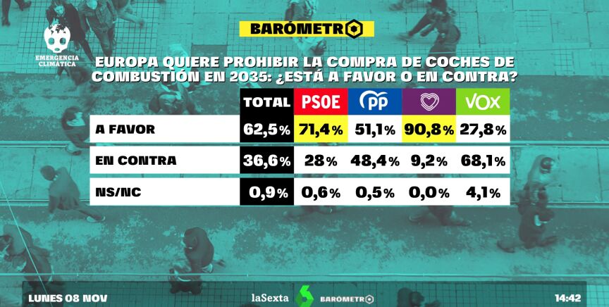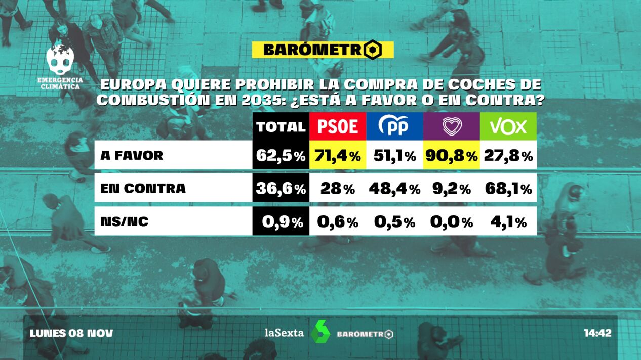 Casi la totalidad de los votantes de la formación morada estarían a favor, al igual que un 79% de los votantes socialistas y un 70% de los que apoyan al PP. Sin embargo, entre los votantes de la extrema derecha solo 3 de cada 10 se muestra partidario de frenar la entrada de los coches contaminantes al centro de las ciudades.