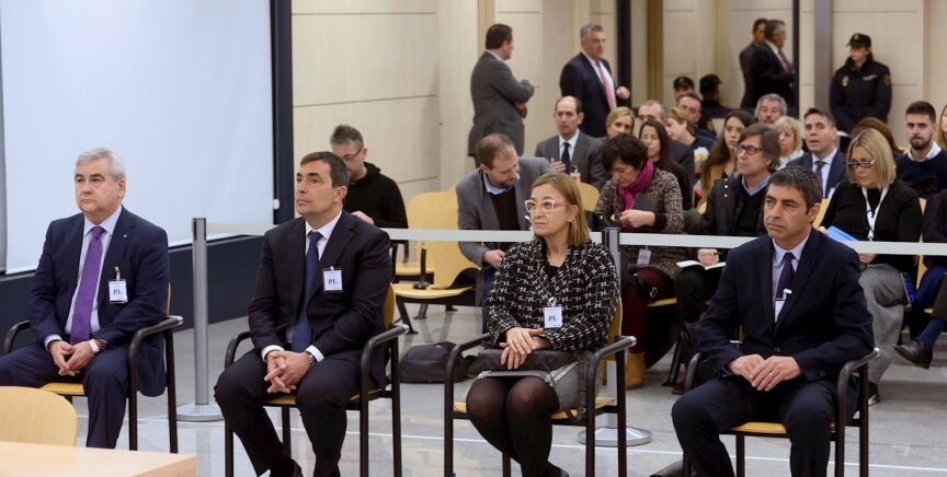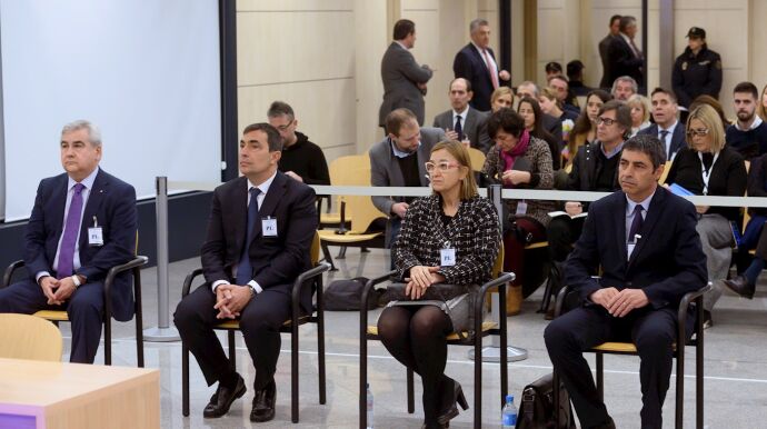 Los tres se sientan en el banquillo por un delito de rebelión, por el que la Fiscalía pide a cada uno 11 años de cárcel, mientras que una cuarta acusada, la intendente de los Mossos Teresa Laplana, se enfrenta a 4 años de cárcel por sedición por su actuación durante el cerco a la Consellería de Economía.