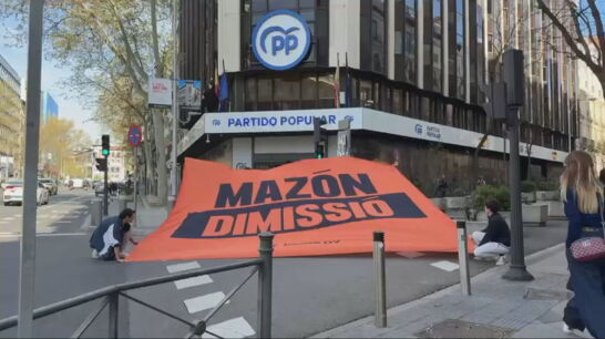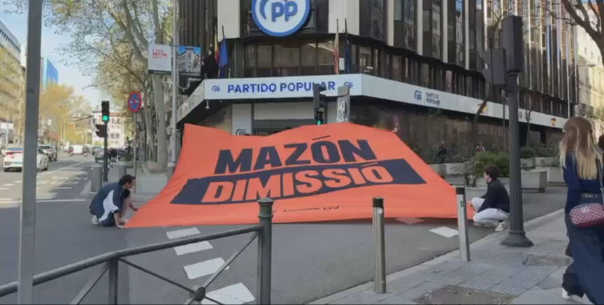 La calle Génova de Madrid ha amanecido este jueves con una imagen llamativa: una lona de seis metros desplegada por las juventudes de Compromís (Joves PV) frente a la sede nacional del Partido Popular. El mensaje, directo: 'Mazón dimissió'.