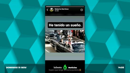 En la imagen que ha compartido el edil del PP en un estado de WhatsApp, se puede ver el coche en el que viajaba Kennedy cuando recibió los disparos que acabaron con su vida el 22 de noviembre de 1963 en Dallas, pero cambiando su cara por la del presidente del Gobierno. A la fotografía manipulada, añade dos mensajes: "Espero que tenga la misma puntería" y "He tenido un sueño".