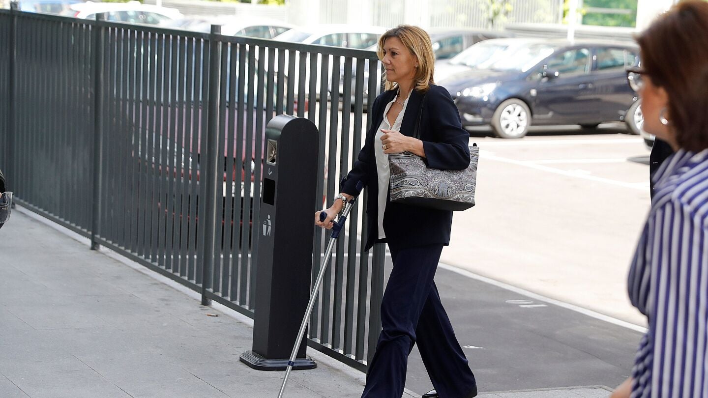 Cospedal ha llegado a la sede de los juzgados de Madrid por la mañana, si bien no ha empezado a declarar hasta pasadas las siete de la tarde debido al retraso que llevaba la sesión. La ex secretaria general ha estado esperando en la habitación reservada para los testigos y ha entrado en la sala de vistas cojeando y ayudada de una muleta.