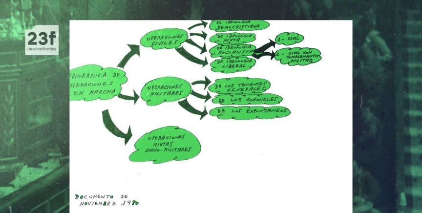 Los documentos desclasificados sobre el golpe de Estado fallido del 23 de febrero de 1981 ya están disponibles en la web de La Moncloa. Entre ellos, destaca un croquis de la Guardia Civil que detalla los movimientos planeados para debilitar al Gobierno de Adolfo Suárez, facilitando así la caída de la democracia. El esquema distingue entre operaciones "civiles", "militares" y "mixtas cívico-militares", mencionando a la UCD y a Miguel Herrero de Miñón en la desestabilización. También se destaca una moción de censura impulsada por el PSOE, con apoyo del PCE, que podría llevar a un general "liberal" a la Presidencia, requiriendo el respaldo de la Corona.
