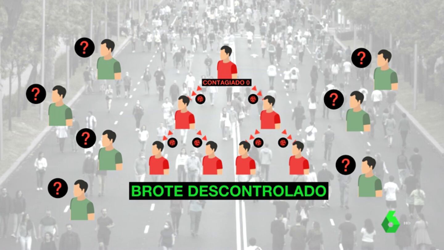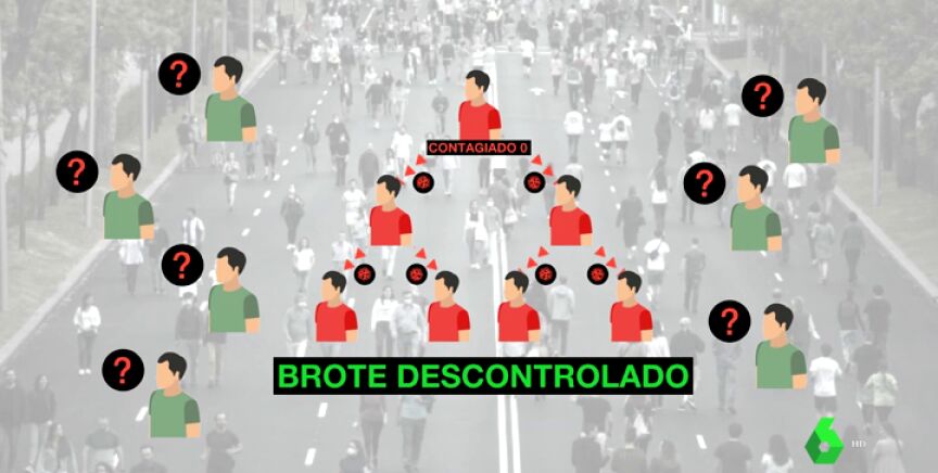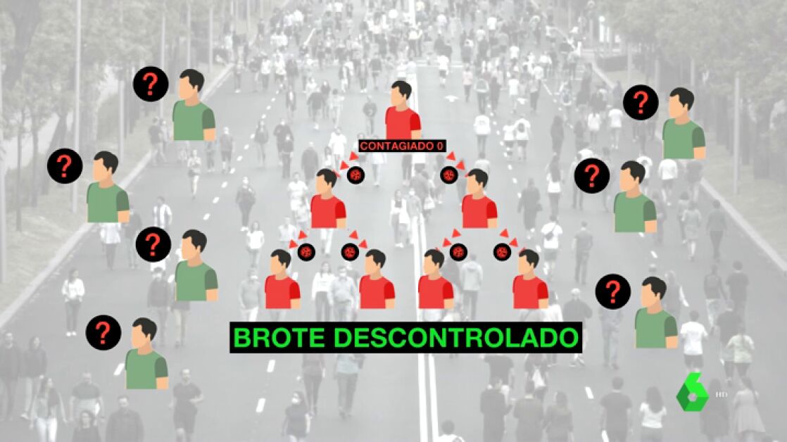 La situación es la siguiente: cuando aparece un positivo se rastrean sus contactos, lo puede llevar a detectar otros casos. Esto, según el ministerio de Sanidad, ya sería un brote, pero sería local y estaría controlado. Sin embargo, cuando empiezan a aumentar las cadenas y a aparecer casos ciegos, es decir, sin contactos positivos, podríamos estar ante un brote descontrolado.