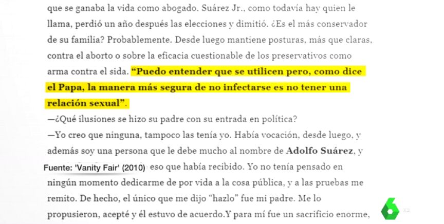 Daba así pinceladas de un perfil religioso que también dejó ver en otra entrevista, ya fuera de política, preguntado por la eficacia de los preservativos y el VIH. "Puedo entender que se utilicen pero, como dice el Papa, la manera más segura de no infectarse es no tener una relación sexual". Vuelve Suárez Illana a la política con palabras polémicas.