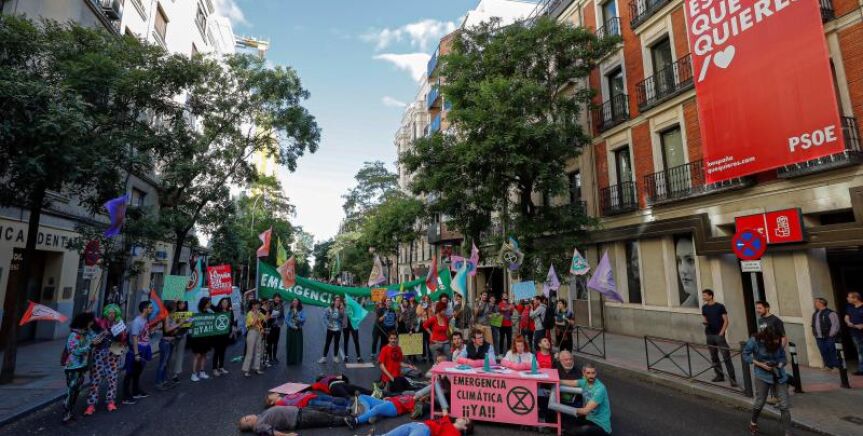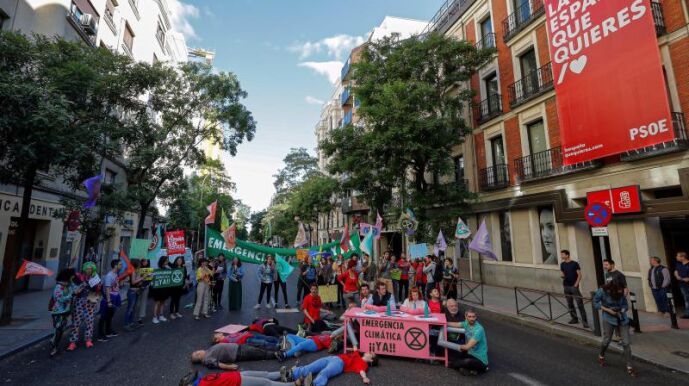 Unas 50 personas han cortado durante una hora la calle Ferraz en Madrid frente a la sede del PSOE al grito de "emergencia climática". Solo han dejado pasar una ambulancia, y se han dispersado al ser recibidos dos de ellos en la sede del PSOE.