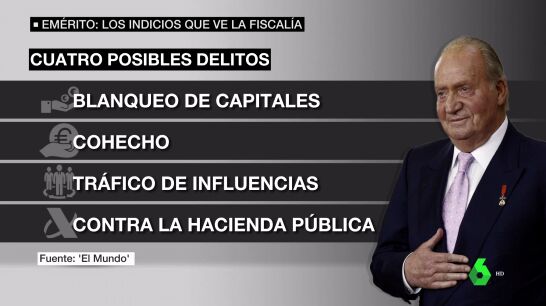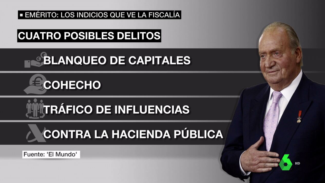 El escrito del Ministerio Público también indica que existen "elementos indiciarios" de la procedencia ilícita del dinero de Juan Carlos I en el extranjero, y apunta a cuatro posibles delitos: blanqueo de capitales, delito contra la Hacienda pública, cohecho y tráfico de influencias. Así, pide a las autoridades suizas información sobre todas las cuentas de la Fundación Zagatka en ese país.