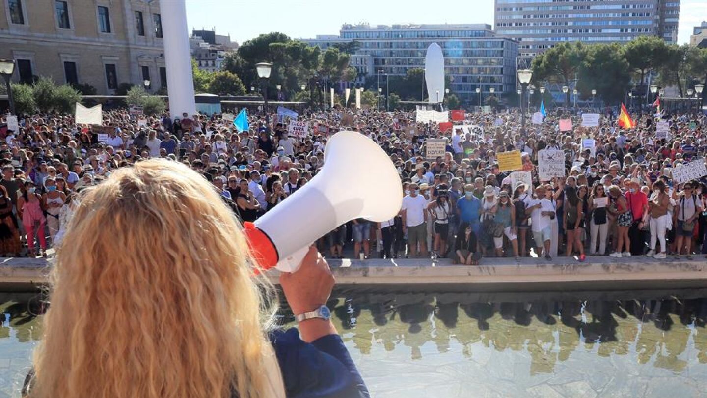 Cientos de manifestantes -sin distancias de seguridad y buena parte de ellos sin mascarilla- se congregaron en el domingo en la plaza de Colón contra el uso de la mascarilla obligatoria. Una medida que consideran "ridícula" y un "recorte" a sus libertades merced a la crisis del coronavirus, pandemia que fue calificada de "farsa" y "mentira" por varios de los asistentes.