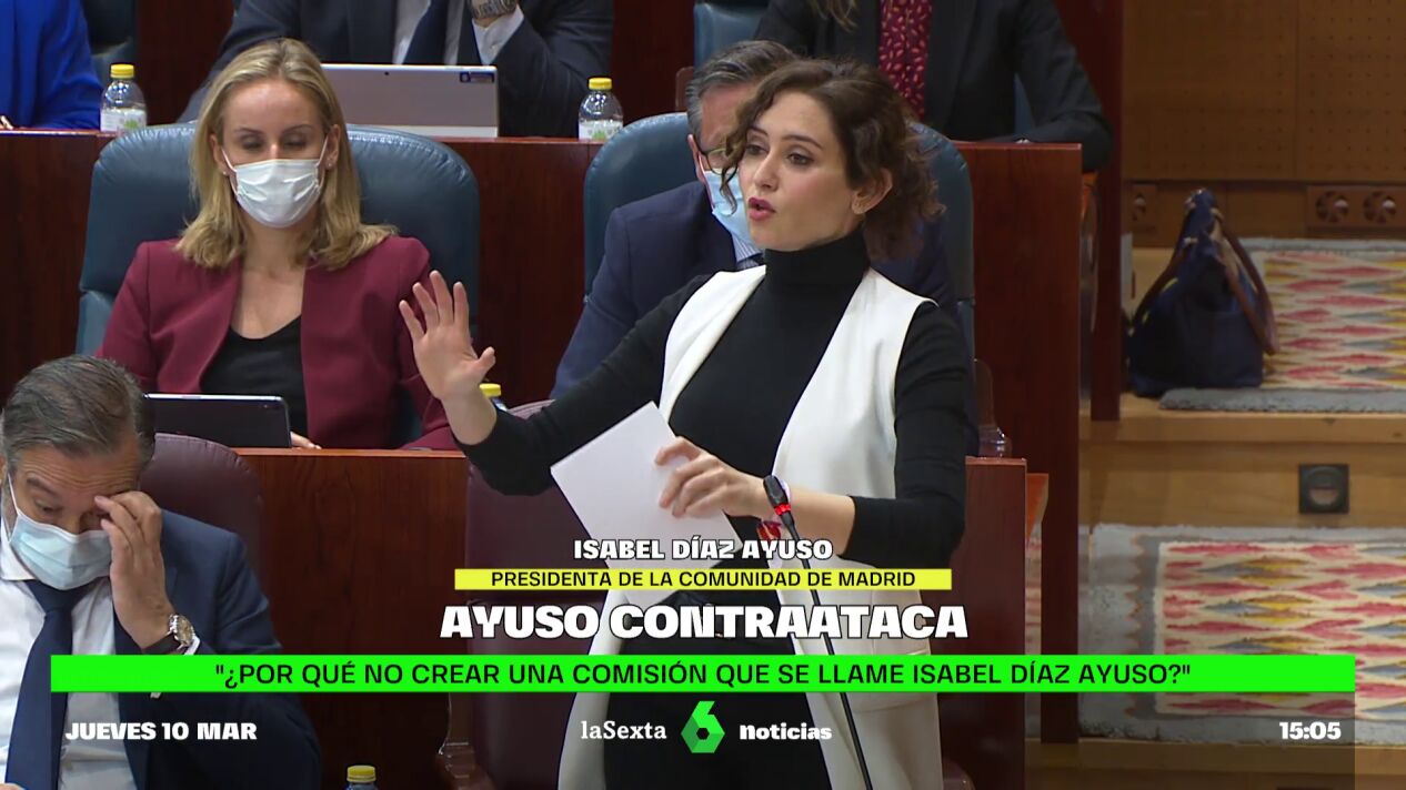 Es la respuesta del PP de Madrid tras la investigación abierta por Anticorrupción por un contrato de 1,5 millones de eurosadjudicado a dedo a una empresa cercana a la familia de Ayuso y la comisión del hermano de la presidenta. "Ahora les tocará a ustedes dar explicaciones, se ha defendido Ayuso en el hemiciclo. "Yo he dado 1.000 explicaciones más sobre el contrato de mi hermano que usted, Mónica García, sobre el sueldo de más que cobró en esta Asamblea", decía Ayuso a la líder de Más Madrid. A lo que García le respondía: "De la Sanidad no se roba, señora Ayuso".