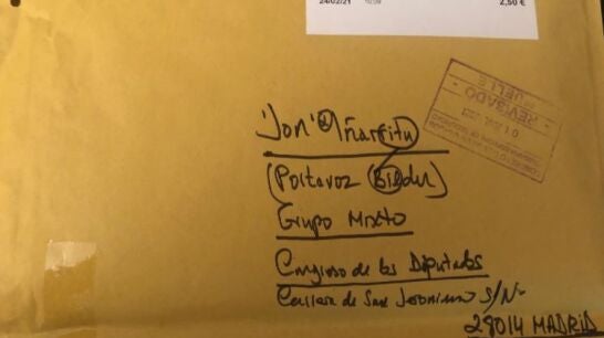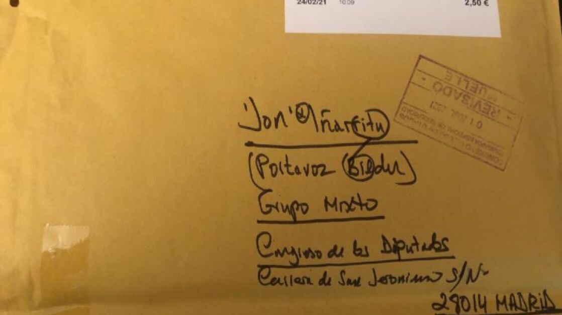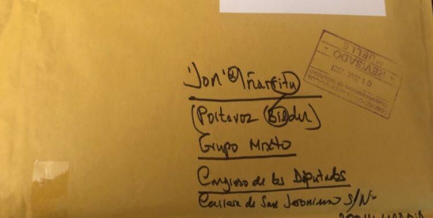 El diputado de Bildu en el Congreso, Jon Iñarritu, ha compartido en su cuenta de Twitter que él también recibió un paquete del hombre que ha enviado una navaja, aparentemente ensangrentada, a la ministra de Industria, Comercio y Turismo, Reyes Maroto.