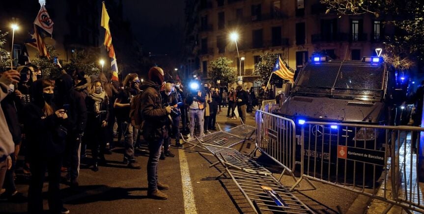 Sin embargo, la protesta ha derivado en momentos de tensión ante el cordón policial que custodia la Delegación del Gobierno. Al grito de "¡Libertad, Pablo Hasel!", y bajo una fuerte presencia policial, numerosos manifestantes han cortado varias calles de la Ciudad Condal, donde se han visto contenedores ardiendo y vallas derribadas,