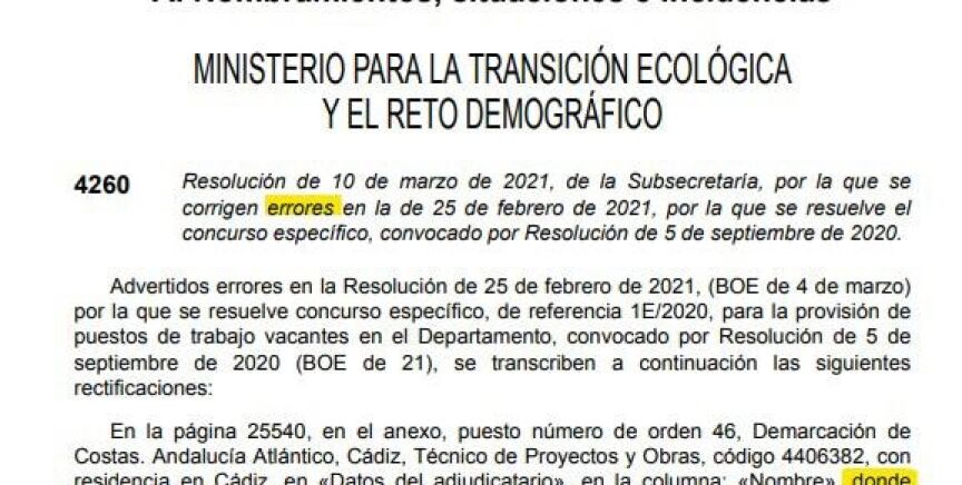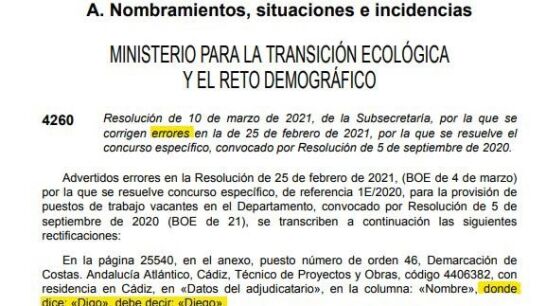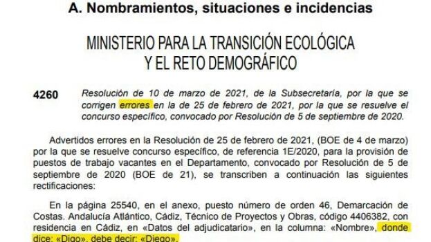 El documento, que subsana un error cometido el 25 de febrero de 2021 sobre nombramientos en el Ministerio para la Transición Ecológica, señalaba que en la columna de un adjudicatario de la página 25540, debía aparecer el nombre de "Diego" en lugar de "Digo"