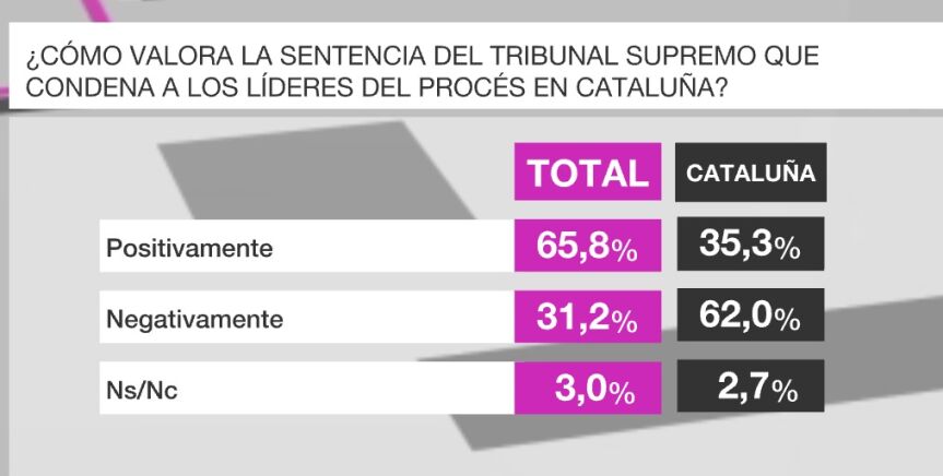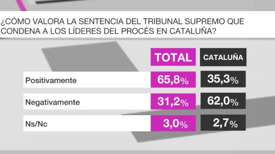 El 65,8% de los españoles valora positivamente la sentencia del Tribunal Supremo que condena a los líderes del Procés, pero el 62% de los catalanes la valora negativamente.