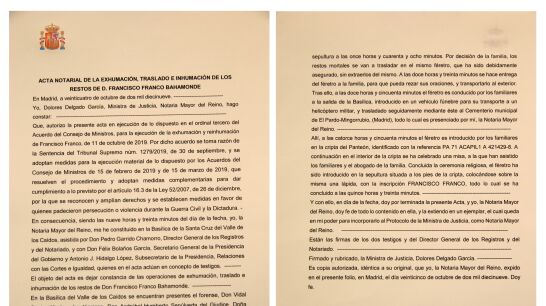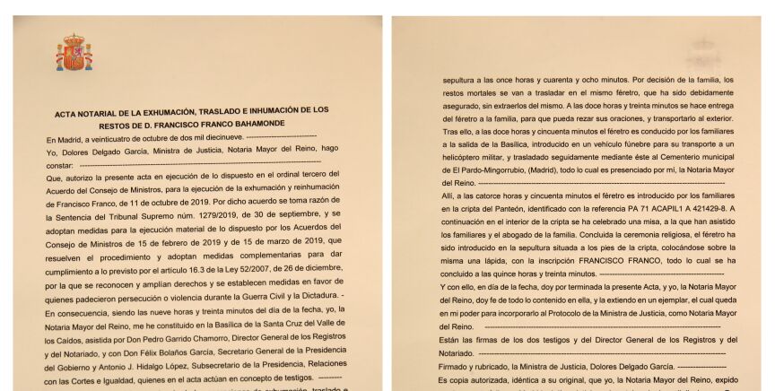 "Se extrae el féretro de la sepultura a las once horas y cuarenta y ocho minutos". El acta notarial de la exhumación de Francisco Franco se encuentra ya bajo custodia en la caja fuerte que guarda los escritos que detallan los acontecimientos políticos más importantes del España desde que murió el dictador.
