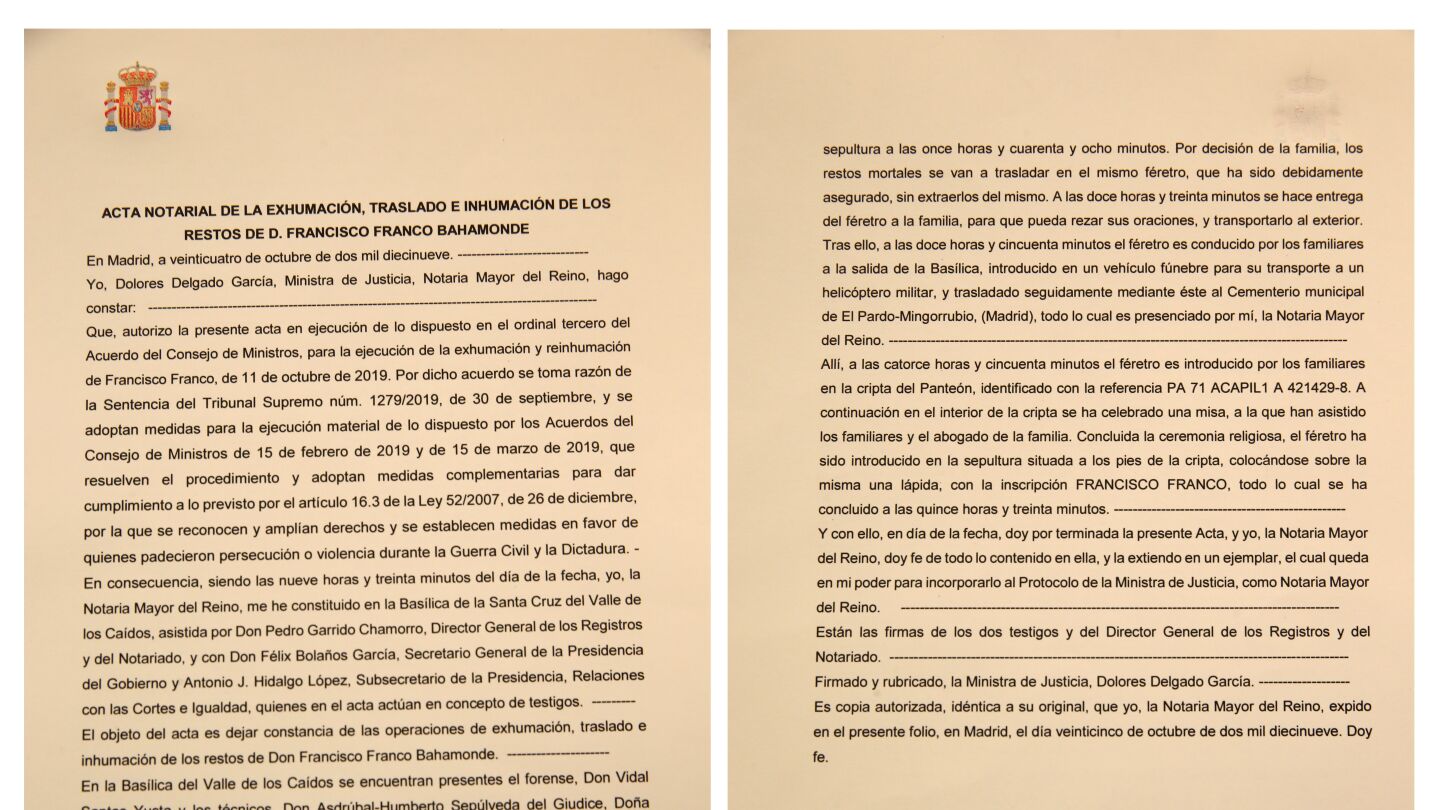 Ninguna conversación, ningún detalle escabroso. Solo un "acta de presencia" en la que se recogen los hechos claves con los que la notaria da fe pública de la ejecución del acuerdo del Consejo de Ministros que determinó la exhumación tras avalarla el Tribunal Supremo.