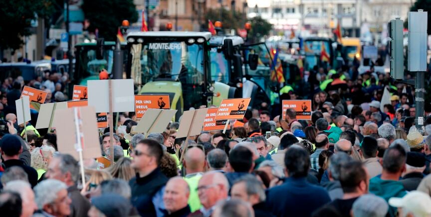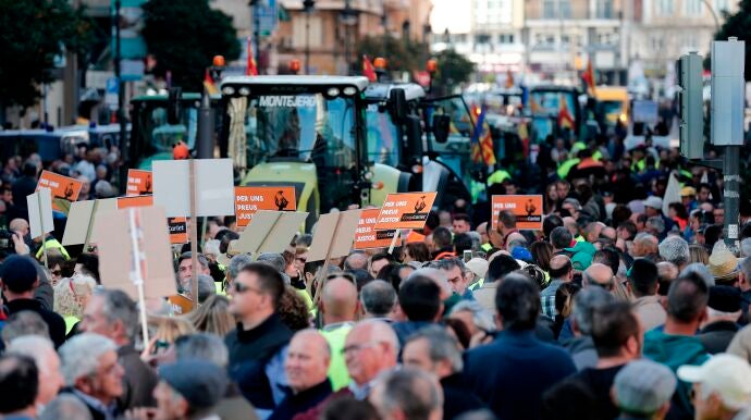 La agricultura, en peligro de extinción. Es lo que se puede leer en una de las pancartas que llevan los agricultores y ganaderos de la Comunidad Valenciana, que este viernes están protestando por los bajos precios en origen de los productos agrarios.