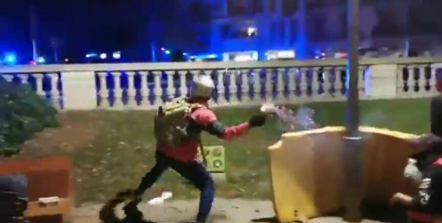 No obstante, otro de los presentes le insta a lanzarla ya. En el vídeo se puede observar cómo el manifestante acaba arrojando el cóctel molotov y cómo este estalla en una bola de fuego a los pocos segundos de tocar el suelo. En total, en la tercera jornada de protestas en Cataluña ardieron 390 contenedores, además de coches y motos.