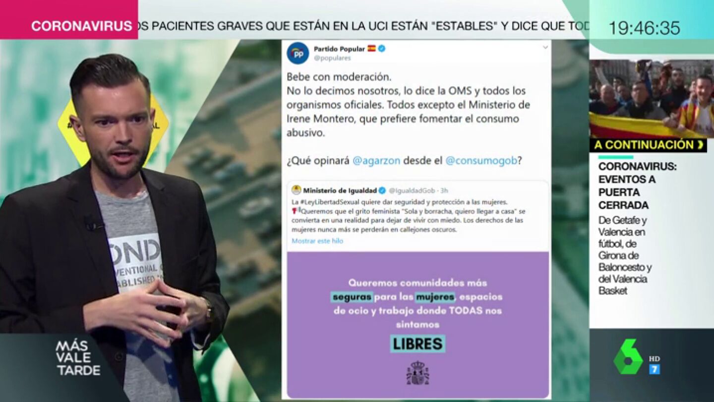 "Bebe con moderación", han respondido los de Pablo Casado, para indicar que no lo dicen ellos, sino la Organización Mundial de la Salud (OMS) y "todos los organismos oficiales". "Todos excepto el Ministerio de Irene Montero, que prefiere fomentar el consumo abusivo", indica.