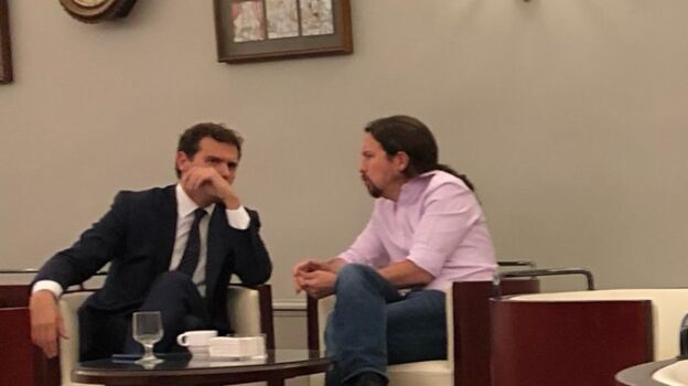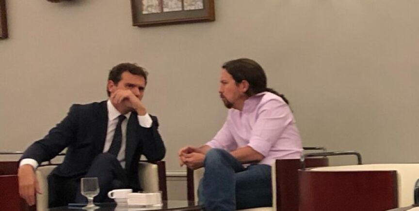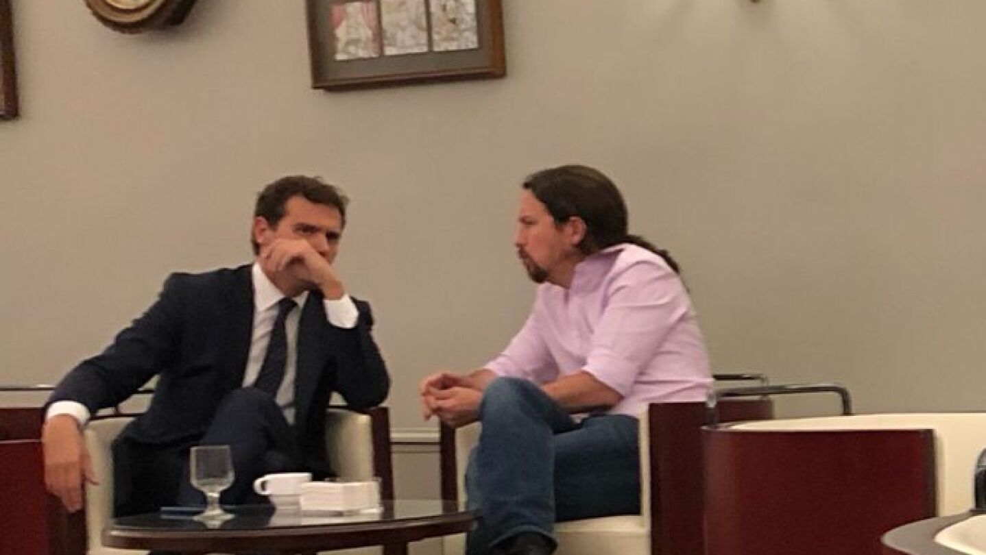 En ese contexto, según fuentes de Unidas Podemos, Rivera a ha pedido a Iglesias reunirse un momento breve. Sin embargo, fuentes de Ciudadanos señalan que ha sido un encuentro casual, y que antes de esa foto charlaron con diputados de otros partidos.