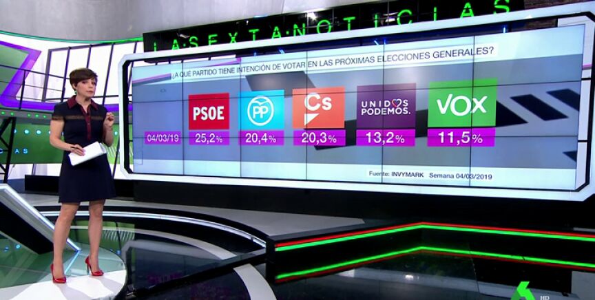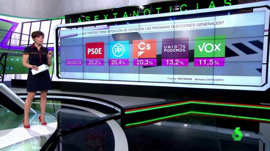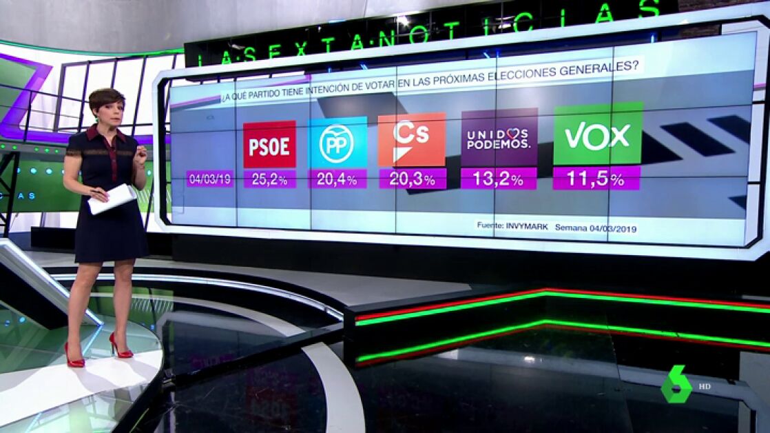 El PSOEaumenta su distancia en intención de voto como primera fuerza política. Según el barómetro de laSexta, el PSOE conseguiría una cuarta parte de los votos: supera el 25,2%. Casi a cinco puntos de distancia se sitúa el PP, por encima del 20,4% del voto y en empate técnico con Ciudadanos. Unidos Podemos sería cuarta fuerza con el 13,2% de votos y luego Vox con el 11,5%.