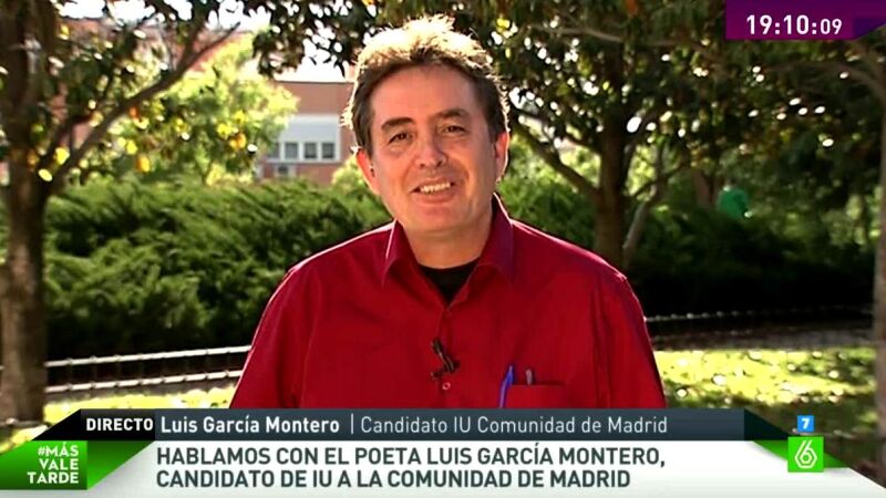 El candidato de IU a la Comunidad de Madrid, el poeta Luis García Montero, ha hablado en 'Más Vale Tarde' horas antes antes de que acabe la campaña electoral: "Mi ilusión era ayudar a mantener el espacio de Izquierda Unida". Asimismo, García Montero ha destacado que él "tiende puentes" porque "es importante sentarse a hablar" en este contexto en el que "la crisis ha golpeado la realidad". Acerca del desarrollo de la campaña, ha explicado que ha dado "unos 25 o 30 mítines" y que ha tenido "muchas reuniones para escuchar a la gente".