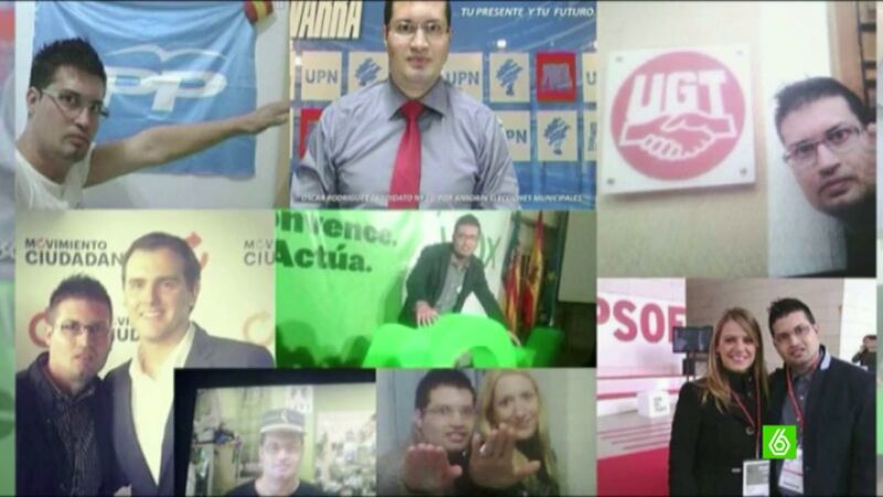 El premio especial 'Pequeño Nicolás en campaña' es para Óscar Rodríguez Manjón, el multicandidato. Un joven expulsado del PP hace dos años por un saludo nazi. Es de Paterna, Valencia, pero se presenta en Ansoain por UPN, por VOX en otro pueblo navarro y por el partido católico Alternativa Española al Ayuntamiento de Madrid.